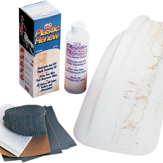Caracteristicas: An inexpensive way to make scratched off-road and ATV plastic look new again Follow a four-step process: sand out scratches; apply Plastic Renew™ base coat; buff lightly with steel wool; apply two more coats and plastic looks virtually new Works on all exterior and interior plastic & rubber parts (except tires), including trim, mirrors, bumpers, running boards, dashes, center consoles, and door panels Works on any color Not affected by normal washing One 8-ounce kit provides many applications