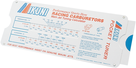 Caracteristicas: The handiest tool of all - a genuine Mikuni pocket-size slide calculator Indicates jetting changes in Mikuni carbs necessitated by ambient temperature, altitude or both A scale is included to determine rich or lean carb conditions Tuner can be used for all single- and multi-carb 2- and 4-stroke applications