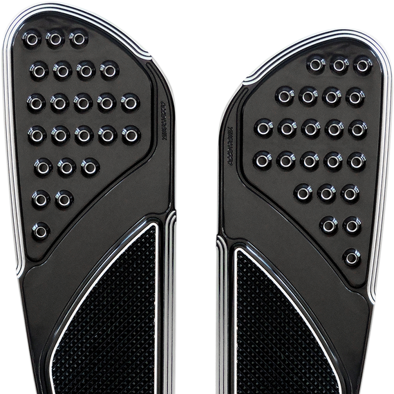 Caracteristicas: Replace the stock OEM front floorboards for a more custom look Extended 63.5 mm (2-1/2") in the front, and 19 mm (3/4") wider and 25.4 mm (1") longer in the rear Mounts like stock with stock hardware Machined with 6061 T-6 billet aluminum The top portion of the board has a raised hole feature inspired by racing pedals The lower area is a multi-directional, slip-resistant Machined Pyramid-Top Knurled design