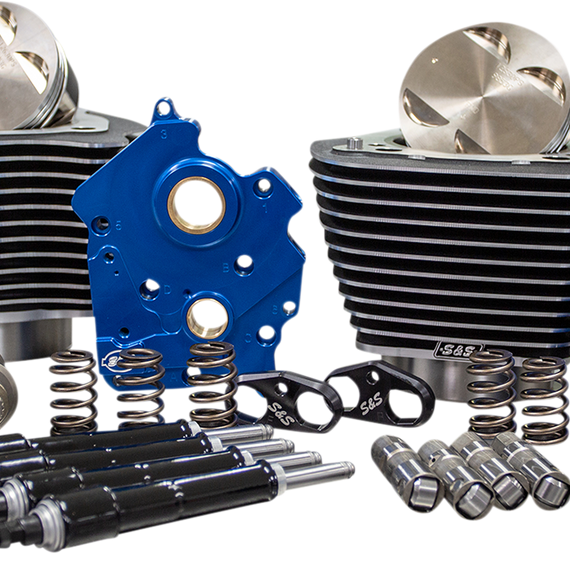 Caracteristicas: Big Bore Kit: Bolt on kit. No case machining required 4.250" bore Forged pistons 11.1: compression ratio Oil Pump/Cam Plate Precision machined from billet aluminum Passage plugs removable for servicing Independent scavenge sections for flywheel cavity and cam chest Debris screens in both scavenge pickups Magnet in cam chest to help to stop debris from entering oil pump Increased flow capacity on both feed and scavenge side Pressure Relief Valve is adjustable with unit installed in engine Pushrods: Quickee pushrods Tappets: S&S premium tappets Tappet Cuffs: Billet aluminum construction Stronger than stock material eliminates distortion Improve tappet stability in high lift and high rpm situations Cam: S&S 550 Cam- Designed for Big Bore applications Valve Springs: Work well with cams up to .605 lift High-performance conical single wire spring Made in the U.S.A.