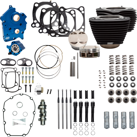 Caracteristicas: Big Bore Kit: Bolt on kit. No case machining required 4.250" bore Forged pistons 11.1: compression ratio Oil Pump/Cam Plate Precision machined from billet aluminum Passage plugs removable for servicing Independent scavenge sections for flywheel cavity and cam chest Debris screens in both scavenge pickups Magnet in cam chest to help to stop debris from entering oil pump Increased flow capacity on both feed and scavenge side Pressure Relief Valve is adjustable with unit installed in engine Pushrods: Quickee pushrods Tappets: S&S premium tappets Tappet Cuffs: Billet aluminum construction Stronger than stock material eliminates distortion Improve tappet stability in high lift and high rpm situations Cam: S&S 550 Cam- Designed for Big Bore applications Valve Springs: Work well with cams up to .605 lift High-performance conical single wire spring Made in the U.S.A.