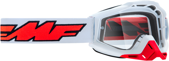 Caracteristicas: Removeable nose guard deflects roost and debris Anti-fog coated polycarbonate lens for clear vision Triple layer moisture managing face foam soaks up sweat 45 mm ultra-wide silicon coated strap ensures a secure fit 9 retention points secure lens in frame All adult FMF goggles share the same lens and tear-offs
