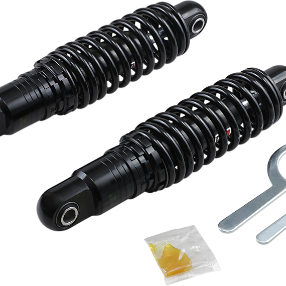 Caracteristicas: Nitrogen-charged steel monotube damper bodies with hard chrome-plated shafts Dual-rate progressive wound springs for a smooth, comfortable ride Adjustable spring preload Ride-height adjustable, +/- 1/2" from size listed Black shocks feature black springs and damper bodies with black end caps/eyelets Mount with existing hardware Shocks shorter than OE length have reduced travel, this may affect the ride quality and handling of the motorcycle. Lowering the motorcycle will reduce ground and cornering clearance. Before purchasing or attempting to install shocks that are different than the OEM length, confirm that your wheel travel can be altered without causing clearance issues such as swingarm/axle to exhaust contact, as well as chain/belt guard or tire contact. OE upper shock mount covers will not fit with these shocks. Not for use with rear lowering kits.