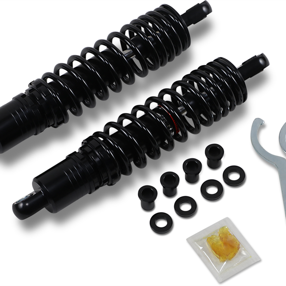 Caracteristicas: Nitrogen-charged steel monotube damper bodies with hard chrome-plated shafts Dual-rate progressive wound springs for a smooth, comfortable ride Adjustable spring preload Ride-height adjustable, +/- 1/2" from size listed Black shocks feature black springs and damper bodies with black end caps/eyelets Mount with existing hardware Shocks shorter than OE length have reduced travel, this may affect the ride quality and handling of the motorcycle. Lowering the motorcycle will reduce ground and cornering clearance. Before purchasing or attempting to install shocks that are different than the OEM length, confirm that your wheel travel can be altered without causing clearance issues such as swingarm/axle to exhaust contact, as well as chain/belt guard or tire contact. OE upper shock mount covers will not fit with these shocks. Not for use with rear lowering kits.