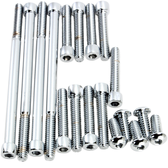 Caracteristicas: Kits feature polished stainless steel or polished chrome steel socket-head bolts Motor sets for Twin Cam include cam cover, primary cover, transmission side cover, oil hose cover, lifter base, rocker box, front inner primary, washer, motor and transmission mount bolts Motor set for M-Eight includes cam cover, primary cover, transmission covers, electric module cover, lifter base, rock boxes, top front motor mount and rear motor mount Side cover set include cam, primary, oil hose cover and transmission side cover Primary set include primary, inspection and derby cover Made in the U.S.A.