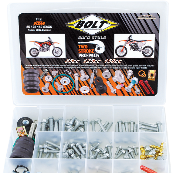 • Includes over 145 pieces of M6 and M8 dimpled flange bolts, concave washers, carb screws, shroud screws, sprocket bolts, Brembo style brake pin clips, three sizes of bushings, rim-lock spacers, drain plug washers, sub-frame bolts, M5 dimpled flange bolts, and valve stem grommets