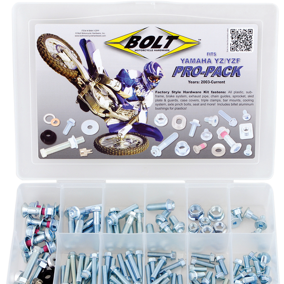 Caracteristicas: Has model specific kits This kit contains 190 pieces of OEM-style hardware in factory style and finish including: factory-style bushing for the bodywork, shroud bolts, seat bolts, sub-frame bolts, fork guard bolts, rotor bolts, a full set of sprocket bolts, T-nuts, rim lock spacers, valve stem grommets and caps, chain adjuster screws, Fuji lock nuts, pan head screws, M8 and M6 flange bolts and drain plug washers