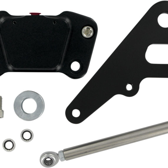 Caracteristicas: Raw metal on black contrast calipers is anodized for a long-lasting high-quality finish Two piston designs for various H-D models (including rigid frames) Hanger brackets and brake pads included For use with 11.5" rotors Made in the U.S.A. The OLD-STYLE Wagner and Kelsey-Hayes (die-cast aluminum OEM) on rear applications have a 3/4" bore master cylinder and WILL NOT WORK CORRECTLY. Not recommended for use with imported stainless steel rotors. Requires use of 5/8" bore master cylinder.