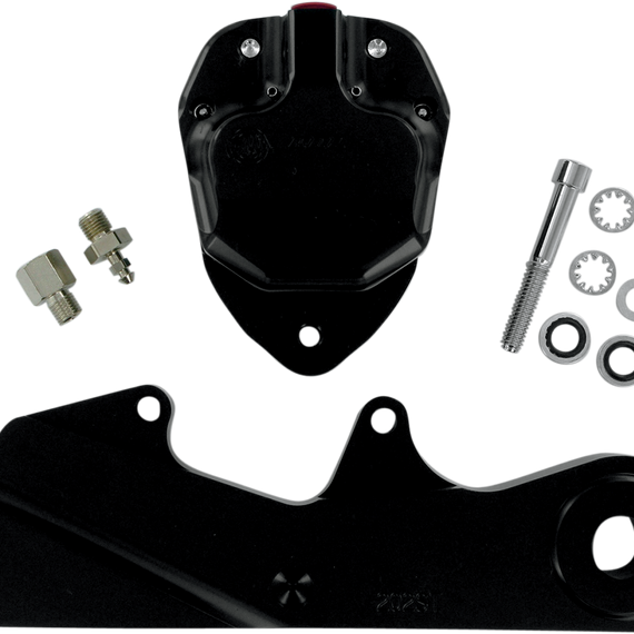 Caracteristicas: Raw metal on black contrast calipers is anodized for a long-lasting high-quality finish Two piston designs for various H-D models (including rigid frames) Hanger brackets and brake pads included For use with 11.5" rotors Made in the U.S.A. The OLD-STYLE Wagner and Kelsey-Hayes (die-cast aluminum OEM) on rear applications have a 3/4" bore master cylinder and WILL NOT WORK CORRECTLY. Not recommended for use with imported stainless steel rotors. Requires use of 5/8" bore master cylinder.