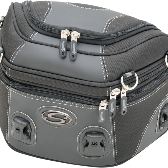Caracteristicas: Shaped to match the rear rack or grab rails of most Adventure or Sportbikes Perfectly sized to carry adequate cargo 10-lb. capacity Measures 8" W x 7" L x 10" T: 13" expanded Black rain cover for extra weather protection