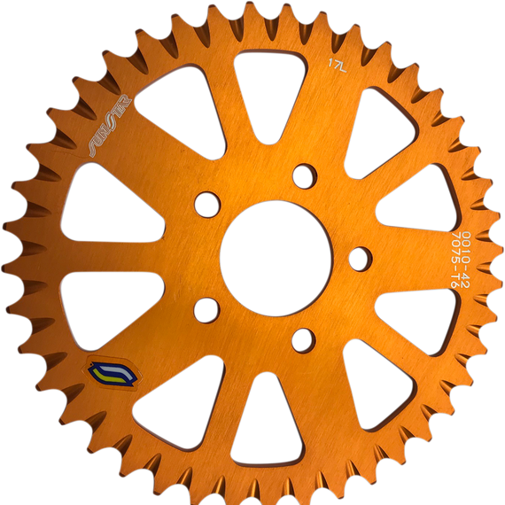 Caracteristicas: Sunstar is the largest OEM and aftermarket supplier of motorcycle and ARV sprockets in the manufacturing world for very major Japanese motorcycle builder since 1946 Constructed of high-quality, aerospace grade 7075 T-6 aluminum Computer-designed weight reduction holes for the best combination of lightness, strength, and stability Exclusive tooth-valley design provides 50% better chain contact area for the best power transfer possible Hard anodized coating for added durability and a superb finish Cleaning grooves added at the bottom of tooth area