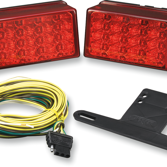 Caracteristicas: Waterproof taillight kit that meets FMVSS/CMVSS requirements for trailers over 80" W Sealed lamp capsule protects LED and electrical contacts Kit includes two low-profile taillights, 25' trailer wiring harness cable with molded four-way plug, 4' four-wire car wiring harness cable with molded four-way plug, license plate bracket and stainless steel mounting hardware Taillights measure 8" W x 27/8" H x 23/4" D Replacement parts/individual components available separately