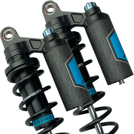 Caracteristicas: Available in Black, Gold and Clear Type III Hard-coat Anodize Legend's touring specific spring rates produce superior ride quality and performance REVO coils provide improved plush ride quality, control, and resistance to bottoming-out REVO's extended coil length has larger "sweet spot" without increasing overall shock length Allows minimal pre-load adjustments by hand when changing between riders' weights or loads Adjusts by hand, no tools needed Available in 13" and 14", standard or heavy-duty applications Easy installation and alignment, provided by spherical bearings on both top and bottom 35 mm monotube construction Deflective disc valve stacks Balanced/Matched piston and base-valve design specific for these motorcycle applications Low friction sealing system and PTFE based sliding bearings for improved performance and feel Seven external knob adjustments allow fine-tuning of rebound Seven external knob adjustments allow fine-tuning of compression Provides optimum rebound and compression performance for any given rider weight, personal ride quality preference, or personal riding style Nitrogen gas bladder design allows ultra-fast response and stiction-free movement Light to heavy riders can fine-tune ride preference Aggressive to casual riding styles can tune to desired quality or personal preference P65 WARNING: Cancer and Reproductive Harm Lifetime Warranty Made by hand in Sturgis, SD USA FL: Heavy Duty applications are recommended for 500lb. + rider and passenger total weight. DYNA, FXR, SPORTSTER: Heavy Duty application are recommended for 250lb.+ rider and passenger total weight. Also consider Heavy Duty if the majority of your riding is 2-UP, stunt riding, or aggressive riding style.