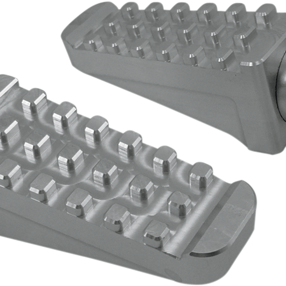 Caracteristicas: Footrests feature an intricately CNC-machined tread pattern in the top surface for optimal footing Much lighter than stock and have an angled design for better road clearance when cornering Replaces stock rubber or cast iron units Machined from solid blocks of 6061 T-6 billet aluminum Full 360° footpeg rotation makes these footpegs perfect for any application Male-mount footpegs have Joker's exclusive pitch adjustment screw to maintain the proper upward angle of the peg Super strong, yet lightweight one-piece construction Installs easily to most stock H-D shift arms with a threaded 5/16"-24 mounting hole (replaces the stock rubber unit) Made in the U.S.A.