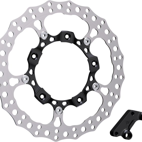 Caracteristicas: 14” Big Brake rotor kits with a CNC machined billet inner carrier Each kit drastically improves braking performance, upgrades the style, and provides an anodized color accent to your factory front wheel Each 14” full floating rotor is constructed from 420 stainless steel outer disc that is drilled for optimum performance and a 6061-billet inner carrier Billet brake caliper adapters are included in each kit to properly relocate your factory caliper to the proper position Utilizes factory brake caliper, rotor hardware and brake hose. Easy bolt-on installation, no need to re-bleed the brake system Designed to fit HD FLT Touring models with factory wheels equipped with spoke mounted rotors Each kit includes 14” rotor, caliper adapter bracket and all necessary hardware