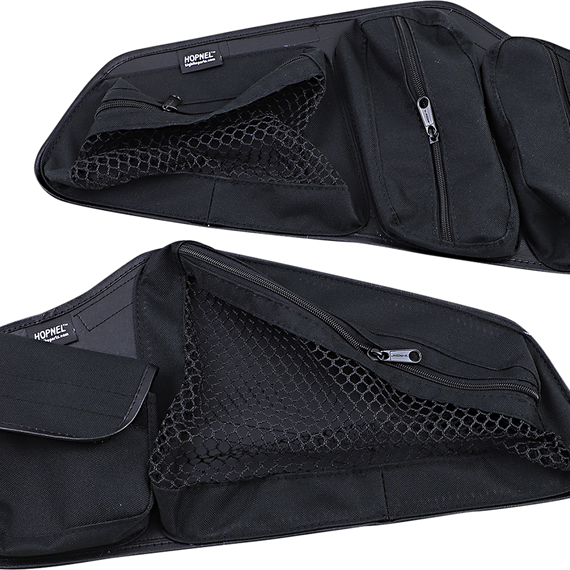 Caracteristicas: Mounts to the inside saddlebag door with Hopnel™ double-sided adhesive hook and loop, allowing easy removal and reinstalling Provides a left and right pair measuring 18¾” x 8” Five convenient pouches for storage, four that are zippered closed and the other with a hook and loop closure and one hidden pocket Two large mesh pouches are great for storing soft goods or letting your damp gear dry, the remaining pouches are made from durable polyurethane coated polyester