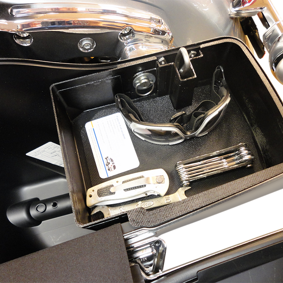 Caracteristicas: Custom-molded plastic tray stores valuables in the top rear section of saddlebags for ease in access Storage for electronic devices, sunglasses and other essentials Removes quickly using the factory ball head stud lock pin Tray works with nylon lid organizers, but not with optional fabric H-D® liners or nylon sidewall pouches. Kit includes: rubber floor mat, mounting spacers and tether screws Tray dimensions: 3-1/2" H x 3" D x 7-1/2" W x 11" L Made in USA