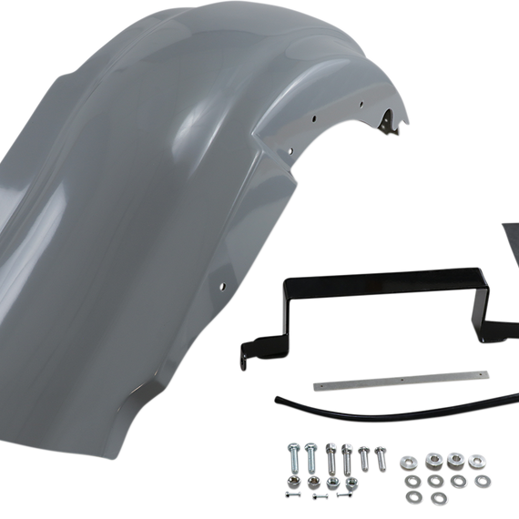 Caracteristicas: Provides custom look while filling the gaps between fender and saddlebags Extended to match length of most stretched saddlebags Constructed from high-quality composite materials Jig-drilled for a perfect fit Kit includes rear fender, hidden steel fender brackets and flexible hidden antennae Fender can fit stock rear tire width and up to 200 mm rear tire width Available in primed and ready to paint finish