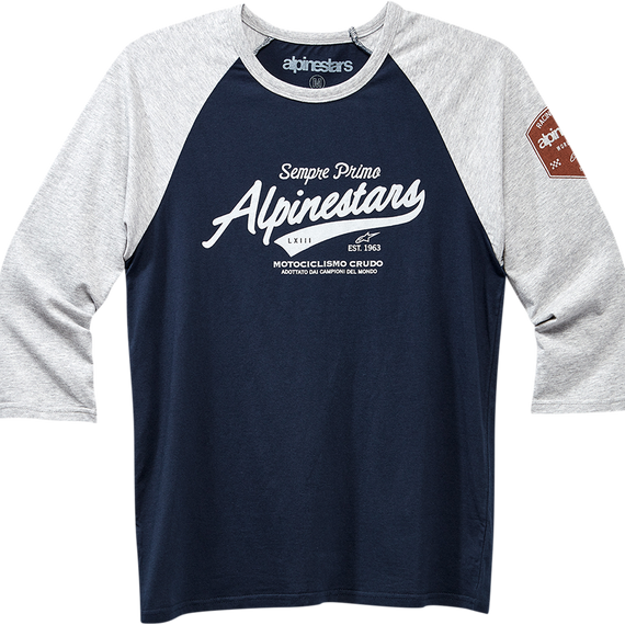 Caracteristicas: Raglan sleeve baseball style premium tee Script word graphic on chest, badge logo graphic on shoulder Soft water base print Internal Alpinestars neck print