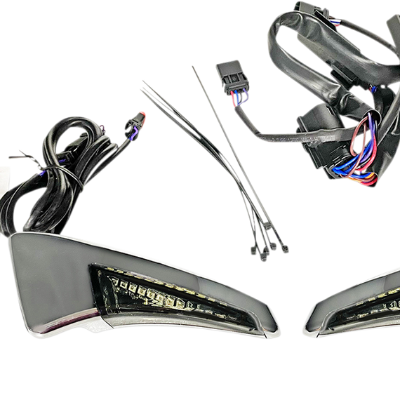 Caracteristicas: Each unit contains 12 dual intensity red LEDs behind a red or smoked lens providing additional running light, brake light and eye-catching sequential red turn signal Units come pre-taped to adhere on the side of the Harley-Davidson King & Ultra style Tour Pak Includes a plug and play wire harness