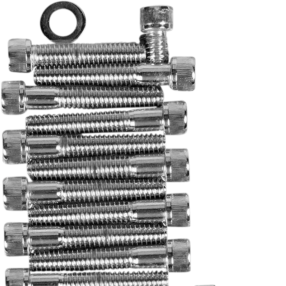 Caracteristicas: Socket-head bolt sets to meet virtually any custom need Complete motor sets for 07 and later Big Twin include bolts for primary, cam, cam sensor, derby, rocker box, transmission top, transmission side, lifter block and clutch covers Complete motor sets for 87-94 Big Twin include bolts for cam, primary, point, clutch, inspection and chain covers, lifter base, inner primary, top front and rear motor mounts, timing plug and header mount screws Complete motor sets for 04 and later XL include bolts for primary, cam, derby, lifter block, points cover, rocker box and engine case Complete motor sets for 86-03 XL include bolts for cam, primary, generator, sprocket, rocker box, top motor mount, lifter base, point or magneto cover Made in the U.S.A.