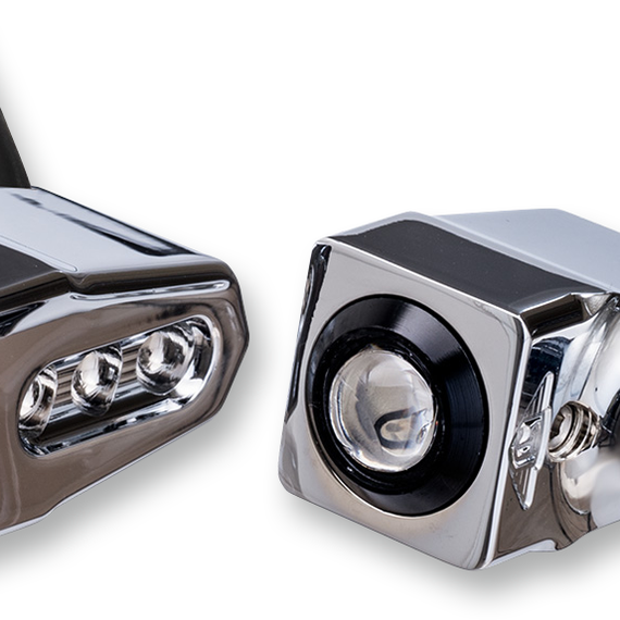 Caracteristicas: Housings are CNC-machined from billet aluminum Exceptional beam angle Single-function design (can be converted to run/turn or run/turn/brake) Side-mounted, wires exit from the back of the signal housing Compact design measures 1.5" L x 0.875" square; stands off the bike 1.20" when mounted Mount to any 5/16" or 8mm hole Mounting hardware included Made in the U.S.A.