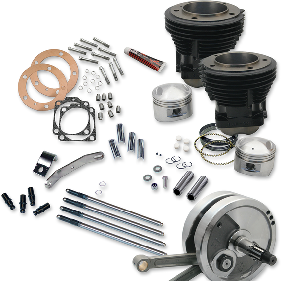 Caracteristicas: Sidewinder Big Bore Stroker Kit Contains nearly everything needed to take a stock 74" or 80" H-D? Shovelhead engine up to 93" or 96" displacement Includes 3.625" bore high tensile, cast iron sidewinder cylinders and forged pistons with wrist pin and rings, a 4.5" or 4.625" stroke, dynamically balanced S&S flywheel assembly complete with S&S heavy duty connecting rods and mainshafts, S&S stainless steel head bolts, base nut, S&S adjustable chromoly steel pushrods, head gaskets, base gaskets, exhaust gaskets, and an S&S heavy-duty top motor mount Made in the U.S.A.