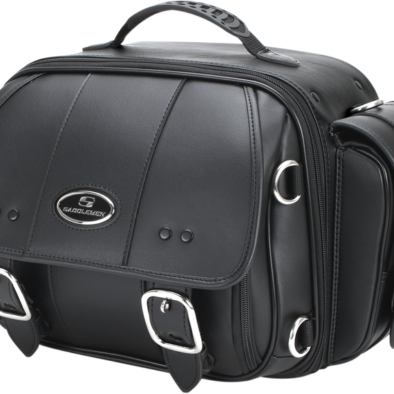 Caracteristicas: Whether it is a day ride or a weekender, Saddlemen's sissy bar bags go the distance Built to last with over-sized hardware, riveted straps/handle and lots of space to pack it full for your journey Main cargo compartment flap opens fully with solid tethered sides for easy loading Adjustable shelf allows you to organize your bag for easy access Works with or without a rack with the newly designed adjustable mounting sleeve that adapts to the shape and width of your bike's sissy bar Heavy-duty leather tech construction EVA molded organizer that stores phone and other valuables safely Multiple over-sized mounting rings around the bag overcome unique mounting challenges Honeycomb rigid luggage shell maintains its shape regardless of cargo load, yet it is lightweight to reduce the impact on your motorcycle Strong nylon meshing zipper teeth with chrome sliders equipped with large pulls for easy use with a gloved hand High-visibility reflective rain cover with locking cinch cord included Measures 14" W X 11" H X 11" D Dimensions are for the main body; side and front pockets add an extra 2.5" to each side.
