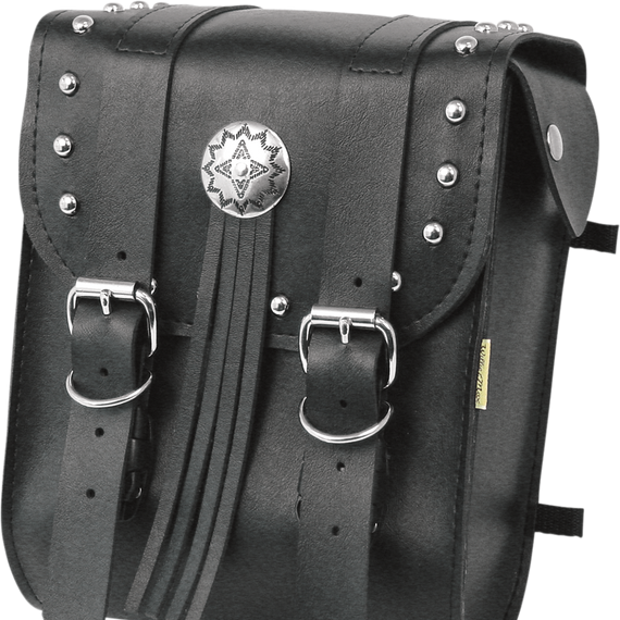 Caracteristicas: Made of black synthetic leather to match American Classic saddlebags Features security snap flap and easy tie-on mounting Quick-release buckles Convenient carry handle Accented with studs, conchos and fringe 8" W x 10" H x 4½" Made in the U.S.A.