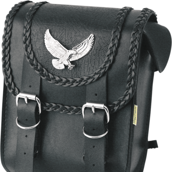 Caracteristicas: Black synthetic leather with multigrained inlay and braided edges; gold and silver eagle accents Quick-release buckles Convenient carry handle Features security snap flap and tie-on mounting 8" W x 10" H x 4½" D Made in the U.S.A.