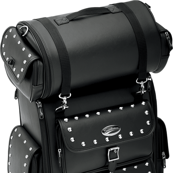 Caracteristicas: Two full side openings allow easy access to bag contents while bag is still mounted on bike Fully adjustable sissy bar mounting system goes on in seconds over any size and style sissy bar pad; once adjusted for your size pad, you never need to adjust it again Rigid construction provides rider support and can be leaned back on when mounted on backseat Multiple exterior pockets Internal adjustable shelf Raincover included Constructed of UV-resistant leather-grain composite Comes with ½" chrome studs Roll bag included for extra cargo capacity (also available separately) Dimensions: 15" W x 18" H x 8"D. Roll bag measures 14" W x 8½" H x 8½" D