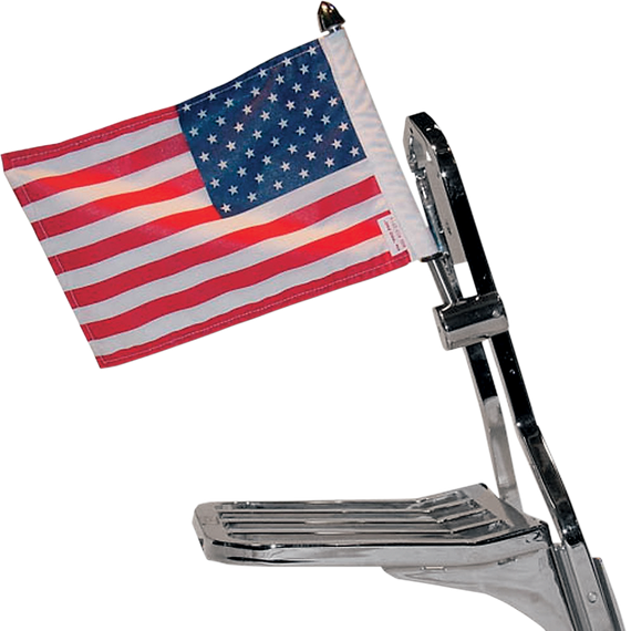 • Polished 304 stainless steel flag mount bolts directly to the bars on most Softails, Sportsters, and Dynas