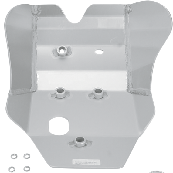 Caracteristicas: Protect vital engine parts and cases from rocks and debris Clear anodized for corrosion protection and good looks Skid plates made from 3/16" 5052 H-32 aluminum Smooth underside won't snag when crossing logs Oil drain hole on all required models Heat-treated chromoly steel clamps keep plates mounted securely All mounting hardware included Made in the U.S.A.