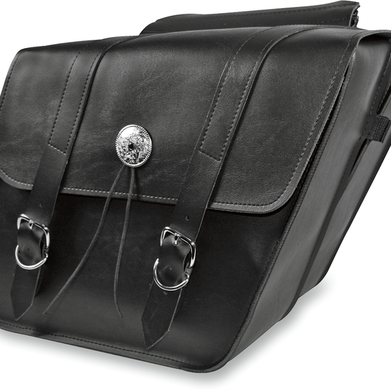 Caracteristicas: Unique angle allows more passenger legroom, conforms to rear shock angle Quick-release buckles Zippered yoke assemblies Each has a silver concho with leather lace trim, two-buckle closure Include a simple tie-down system Made in the U.S.A. Saddlebag supports are recommended for all saddlebags. All saddlebags are fully reinforced with internal plastic tub allowing for hard-mount and quick-release modifications.