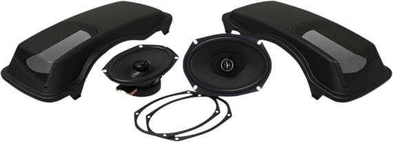 Caracteristicas: Speakers angled toward rider for best sound Includes 200 watt 2 ohm XL Series 6x9” speakers made for motorcycle environment (200 Watts per speaker) Built-in water drainage system keeps everything dry High quality/high impact ABS replacement saddlebag lids Comes matte black, primed and ready for paint Metal mesh grills, gaskets, striker plates, grommets, wire harness and all required hardware is included Included wire harness will plug into any current Hogtunes amp or other amp Works with OEM and most aftermarket latches