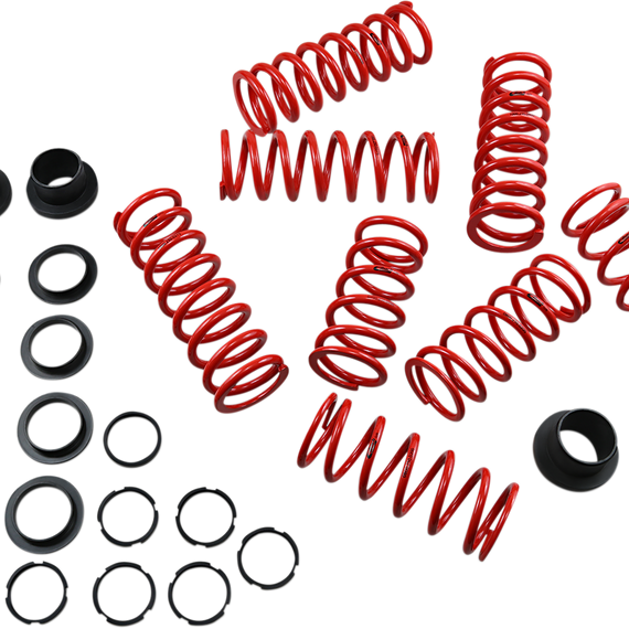 Caracteristicas: All systems include springs, sliders, stop rings and complete setup instructions Race-proven durability and quality Engineered and tested by drivers Designed for 2- and 4-seat vehicles Adjustable shock lockout collars included to allow fine-tuning of the transition point of the dual-spring setup Improves turn-in response and better power hookup out of the turns Smoother ride over rough terrain Stiffer spring rates prevent bottoming in the G-outs Made in the U.S.A.