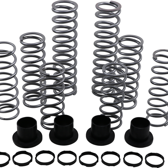 Caracteristicas: All systems include springs, sliders, stop rings and complete setup instructions Race-proven durability and quality Engineered and tested by drivers For 2- and 4-seat vehicles with higher loads and multiple passengers More aggressive spring rates keep the machine balanced Adjustable shock lockout collars included to allow fine-tuning of the transition point of the dual-spring setup Improves turn-in response and better power hookup out of the turns Smoother ride over rough terrain Stiffer spring rates prevent bottoming in the G-outs Made in the U.S.A.