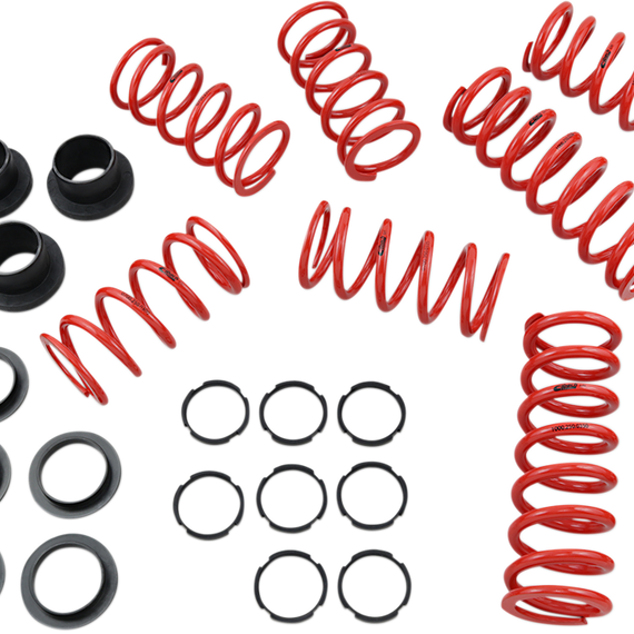 Caracteristicas: All systems include springs, sliders, stop rings and complete setup instructions Race-proven durability and quality Engineered and tested by drivers For 2- and 4-seat vehicles with higher loads and multiple passengers More aggressive spring rates keep the machine balanced Adjustable shock lockout collars included to allow fine-tuning of the transition point of the dual-spring setup Improves turn-in response and better power hookup out of the turns Smoother ride over rough terrain Stiffer spring rates prevent bottoming in the G-outs Made in the U.S.A.