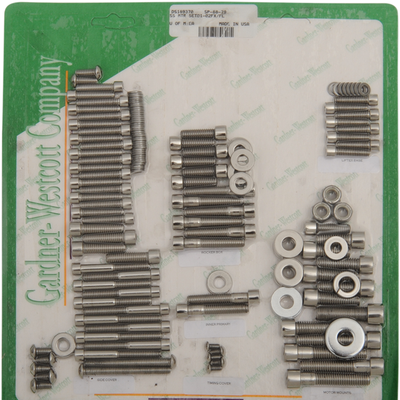 Caracteristicas: Motor sets include cam cover, primary cover, transmission side cover, oil hose cover, lifter base, rocker box, front inner primary, washer, motor and transmission mount bolts Side cover sets include cam, primary, oil hose cover and transmission side cover Primary sets include primary, inspection and derby covers Made in the U.S.A.