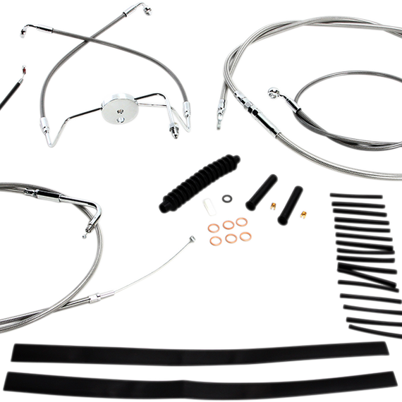 Caracteristicas: Magnum XR Handlebar Installation Kits offer a great fit and excellent quality at an economical price Kit features highly polished, chrome plated fittings All cables are a low effort, high efficiency design that meets or exceeds all OE specifications for fitment, construction, endurance Magnum XR Brake Lines use an enhanced construction of heavy gauge stainless steel embedded in tough abrasion resistant nylon outer jacket for superior durability and extreme braking response for safe riding The coating on cables and brake lines offers exceptional protection for paint or chrome Kits that include manifolds use an all brazed construction to ensure optimal OE fitment and appearance Manifolds use -3 AN connections for an easy installation Kits include throttle and idle cables or throttle-by-wire extensions, clutch cable or XR hydraulic clutch line, XR brake lines, copper crush washers, hardware, turn signal and switch wiring extensions Kits are based on using ape hanger style handlebars and 2" risers.