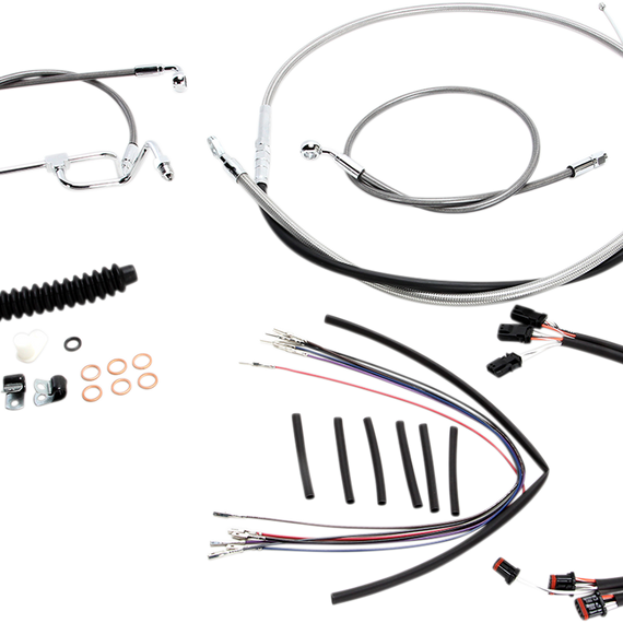 Caracteristicas: Magnum XR Handlebar Installation Kits offer a great fit and excellent quality at an economical price Kit features highly polished, chrome plated fittings All cables are a low effort, high efficiency design that meets or exceeds all OE specifications for fitment, construction, endurance Magnum XR Brake Lines use an enhanced construction of heavy gauge stainless steel embedded in tough abrasion resistant nylon outer jacket for superior durability and extreme braking response for safe riding The coating on cables and brake lines offers exceptional protection for paint or chrome Kits that include manifolds use an all brazed construction to ensure optimal OE fitment and appearance Manifolds use -3 AN connections for an easy installation Kits include throttle and idle cables or throttle-by-wire extensions, clutch cable or XR hydraulic clutch line, XR brake lines, copper crush washers, hardware, turn signal and switch wiring extensions Kits are based on using ape hanger style handlebars and 2" risers.