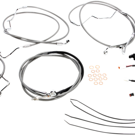 Caracteristicas: Magnum XR Handlebar Installation Kits offer a great fit and excellent quality at an economical price Kit features highly polished, chrome plated fittings All cables are a low effort, high efficiency design that meets or exceeds all OE specifications for fitment, construction, endurance Magnum XR Brake Lines use an enhanced construction of heavy gauge stainless steel embedded in tough abrasion resistant nylon outer jacket for superior durability and extreme braking response for safe riding The coating on cables and brake lines offers exceptional protection for paint or chrome Kits that include manifolds use an all brazed construction to ensure optimal OE fitment and appearance Manifolds use -3 AN connections for an easy installation Kits include throttle and idle cables or throttle-by-wire extensions, clutch cable or XR hydraulic clutch line, XR brake lines, copper crush washers, hardware, turn signal and switch wiring extensions Kits are based on using ape hanger style handlebars and 2" risers.