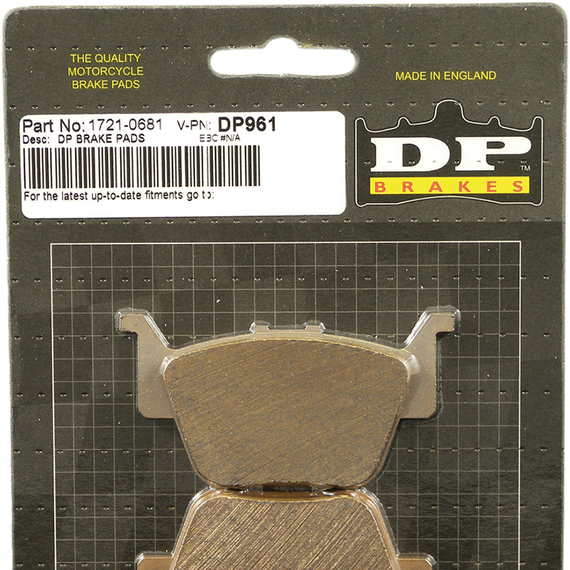 Caracteristicas: DP Brakes Brake Pads are designed with sintered metal compounds to give your ATV high-tech performance in all conditions Pads have a quick break-in period so you get maximum performance fast DP Brakes design and materials ensure consistent, hard stops and fade-free performance Sintered metal compounds outlast more conventional organic or aramid fiber pads Use DP Brakes Rotors in conjunction with DP Brakes Brake Pads for the ultimate in braking performance GG-friction rated and made with DP Brakes' proven sintered-metal material Gray-colored aluminum oxide-based ceramic material on rear of back plate keeps heat away from caliper piston and fluid in extreme conditions for fade-free performance Pad compound gives equal performance in wet or dry conditions The ideal replacement pad where durability is the prime requirement TUV/KBA approved to EEC braking regulation 13/05 Bright, attractive pegboard packaging