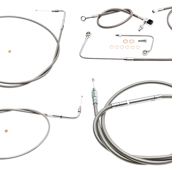 Caracteristicas: Take "cable calculation" headaches out of swapping handlebars Standard kits include the correct length brake/clutch lines and wire extensions to complete a handlebar swap; electrical wire extensions not included (available separately) Standard kits include clutch line, brake lines, chrome "T" brake line junction, banjo bolts, fittings and copper crush washers Made in the U.S.A. Kits are based on using 2" risers with Ape Hanger handlebars