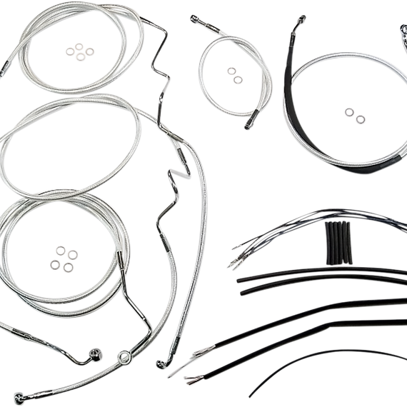 Caracteristicas: Complete kits with matching braided cables and brake lines Kits include throttle and idle cables of throttle-by-wire extensions, clutch cable or hydraulic clutch line, brake lines, copper crush washers, hardware, and any necessary switch wiring of turn signal extension All cable and brake lines feature Sterling Chromite II braid with highly polished chrome plated fittings All cables are a low-effort, high-efficiency design that meets or exceeds all OE specifications for fitment, construction and endurance Kits for dual disc models include an all brazed manifold that eliminates leaks, alignment problems and unattractive threaded connections Assembled in the U.S.A. Kits are based on using ape hanger style handlebars with 2” risers