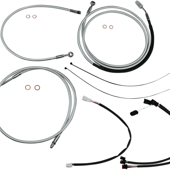 Caracteristicas: Reuses existing lower brake line The only complete kits with matching braided cables and brake lines Kits include throttle and idle cables of throttle-by-wire extensions, clutch cable or hydraulic clutch line, brake lines, copper crush washers, hardware, and any necessary switch wiring of turn signal extension All cable and brake lines feature Sterling Chromite II braid with highly polished chrome plated fittings All cables are a low-effort, high-efficiency design that meets or exceeds all OE specifications for fitment, construction, endurance Kits for dual disc models include an all brazed manifold that eliminates leaks, alignment problems and unattractive threaded connections Assembled in the U.S.A. Kits are based on using ape hanger style handlebars with 2” risers