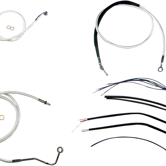 Caracteristicas: Reuses existing lower brake line The only complete kits with matching braided cables and brake lines Kits include throttle and idle cables of throttle-by-wire extensions, clutch cable or hydraulic clutch line, brake lines, copper crush washers, hardware, and any necessary switch wiring of turn signal extension All cable and brake lines feature Sterling Chromite II braid with highly polished chrome plated fittings All cables are a low-effort, high-efficiency design that meets or exceeds all OE specifications for fitment, construction, endurance Kits for dual disc models include an all brazed manifold that eliminates leaks, alignment problems and unattractive threaded connections Assembled in the U.S.A. Kits are based on using ape hanger style handlebars with 2” risers