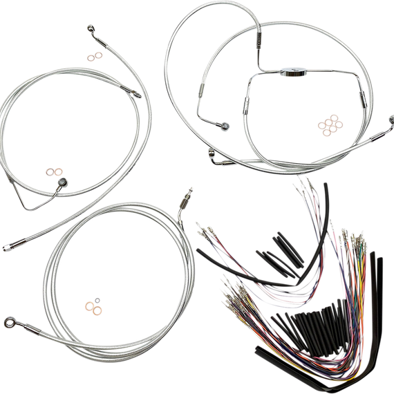 Caracteristicas: Complete kits with matching braided cables and brake lines Kits include throttle and idle cables of throttle-by-wire extensions, clutch cable or hydraulic clutch line, brake lines, copper crush washers, hardware, and any necessary switch wiring of turn signal extension All cable and brake lines feature Sterling Chromite II braid with highly polished chrome plated fittings All cables are a low-effort, high-efficiency design that meets or exceeds all OE specifications for fitment, construction and endurance Kits for dual disc models include an all brazed manifold that eliminates leaks, alignment problems and unattractive threaded connections Assembled in the U.S.A. Kits are based on using ape hanger style handlebars with 2” risers