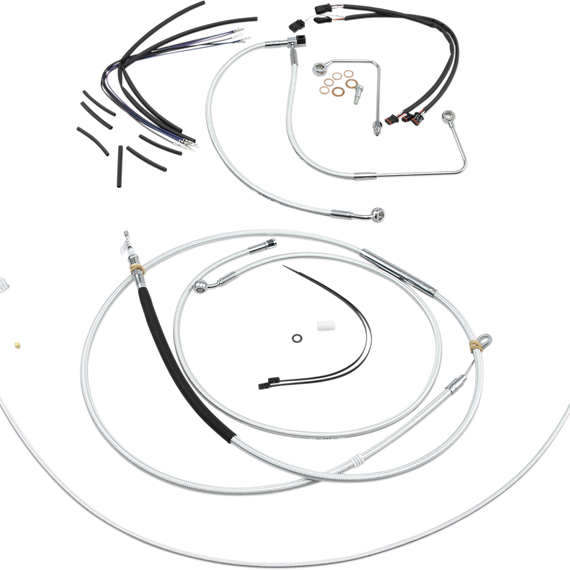 Caracteristicas: Complete kits with matching braided cables and brake lines Kits include throttle and idle cables of throttle-by-wire extensions, clutch cable or hydraulic clutch line, brake lines, copper crush washers, hardware, and any necessary switch wiring of turn signal extension All cable and brake lines feature Sterling Chromite II braid with highly polished chrome plated fittings All cables are a low-effort, high-efficiency design that meets or exceeds all OE specifications for fitment, construction and endurance Kits for dual disc models include an all brazed manifold that eliminates leaks, alignment problems and unattractive threaded connections Assembled in the U.S.A. Kits are based on using ape hanger style handlebars with 2” risers