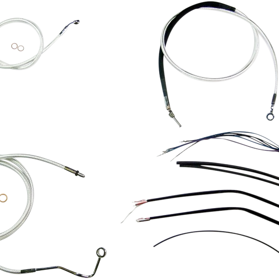 Caracteristicas: Reuses existing lower brake line The only complete kits with matching braided cables and brake lines Kits include throttle and idle cables of throttle-by-wire extensions, clutch cable or hydraulic clutch line, brake lines, copper crush washers, hardware, and any necessary switch wiring of turn signal extension All cable and brake lines feature Sterling Chromite II braid with highly polished chrome plated fittings All cables are a low-effort, high-efficiency design that meets or exceeds all OE specifications for fitment, construction, endurance Kits for dual disc models include an all brazed manifold that eliminates leaks, alignment problems and unattractive threaded connections Assembled in the U.S.A. Kits are based on using ape hanger style handlebars with 2” risers